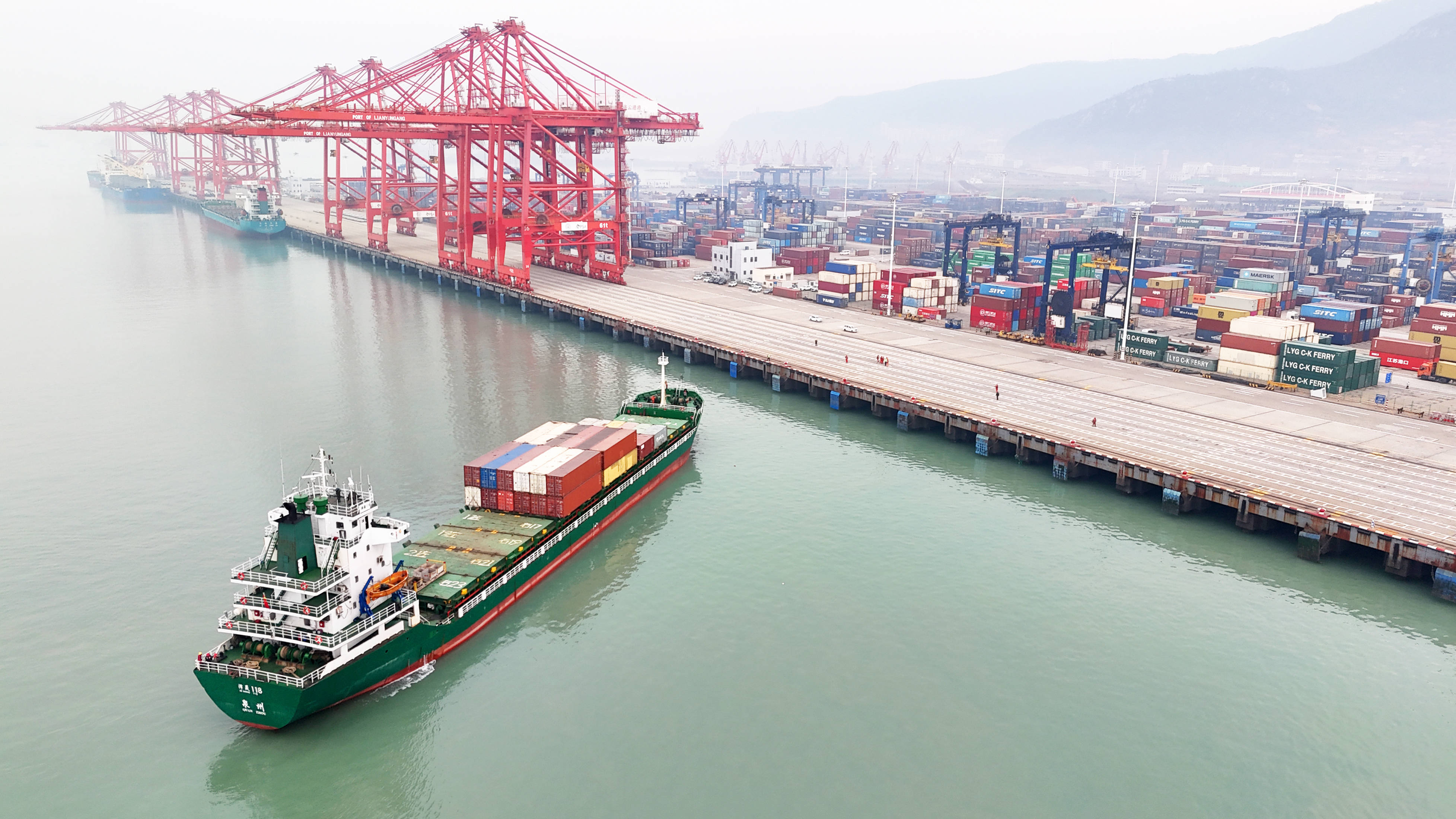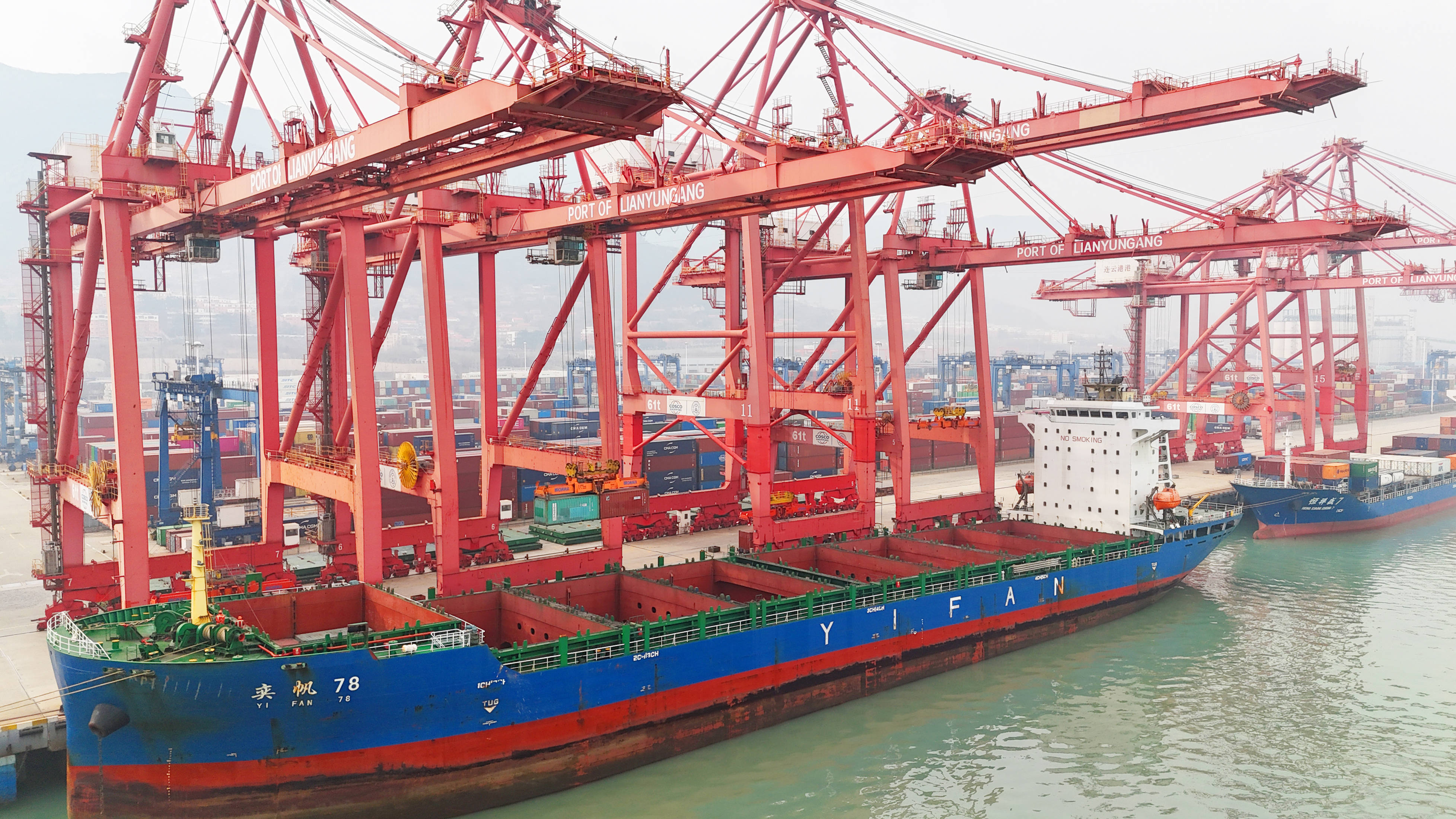 在江苏连云港港集装箱码头,船只忙碌地装卸货物。