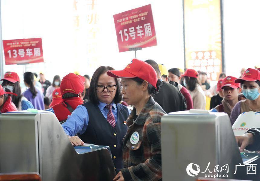 为确保务工人员顺畅进站乘车,国铁南宁局提前与人社部门联系,根据务工人员出行需求制定务工专列客运组织方案,南宁东站开辟安检、进站绿色通道,保障返岗务工人员温馨舒适出行;贵港、桂林北、阳朔站安排工作人员和志愿者在站台、出站口、停车场等关键处所提供咨询指引、行李搬运等服务;来宾北站设置务工候车区,安排“刘三姐·石榴籽”志愿服务队全程引导务工人员。