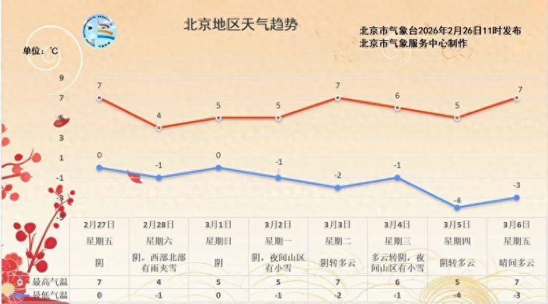 气温方面,预计午后北京最高气温在10℃上下,夜间最低气温在0℃左右。阴云加重时,体感有些阴冷,请注意保暖。