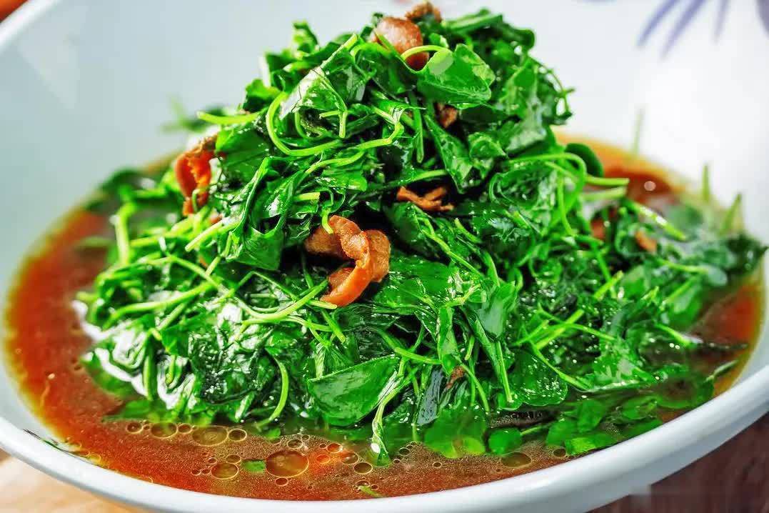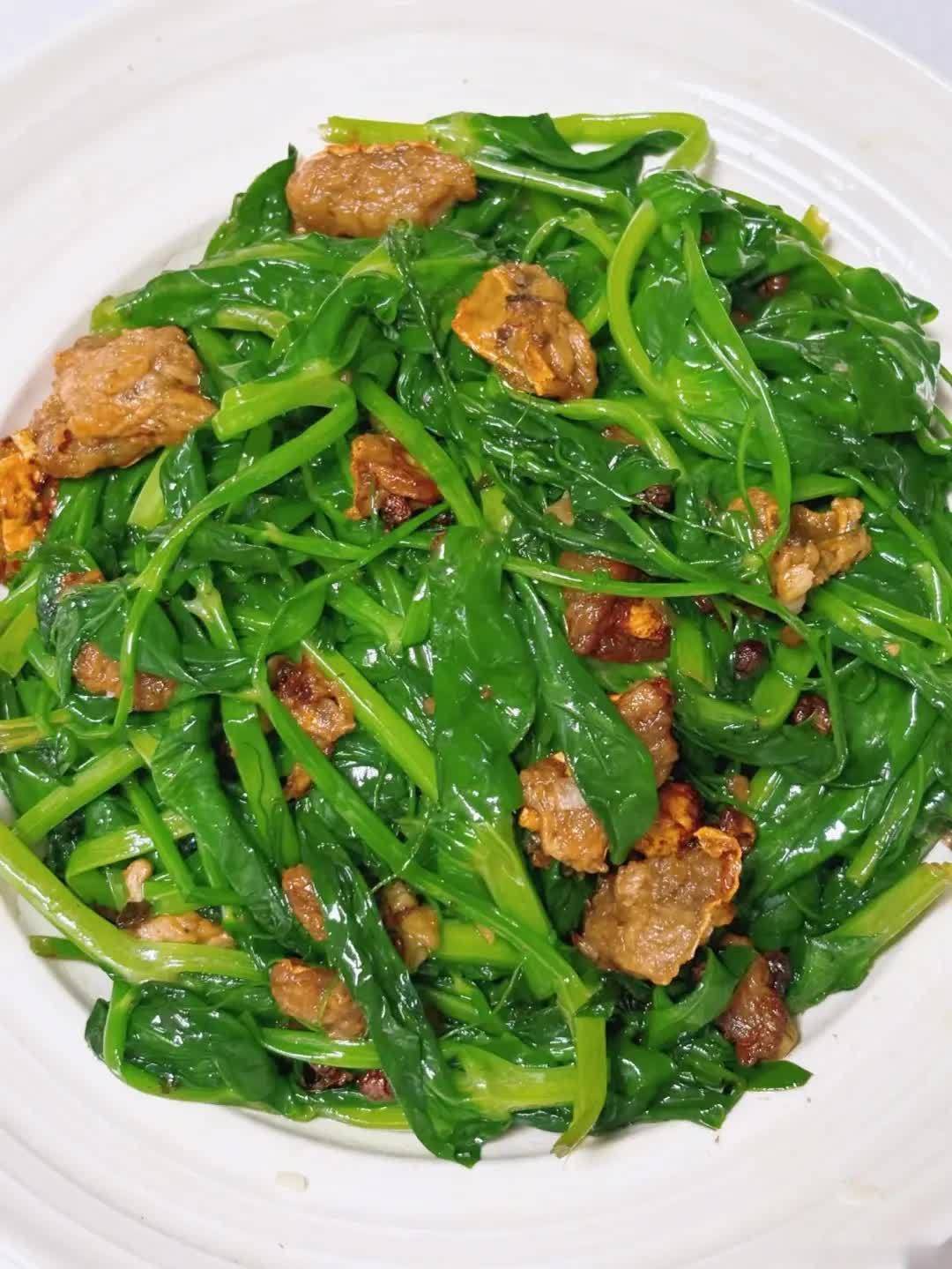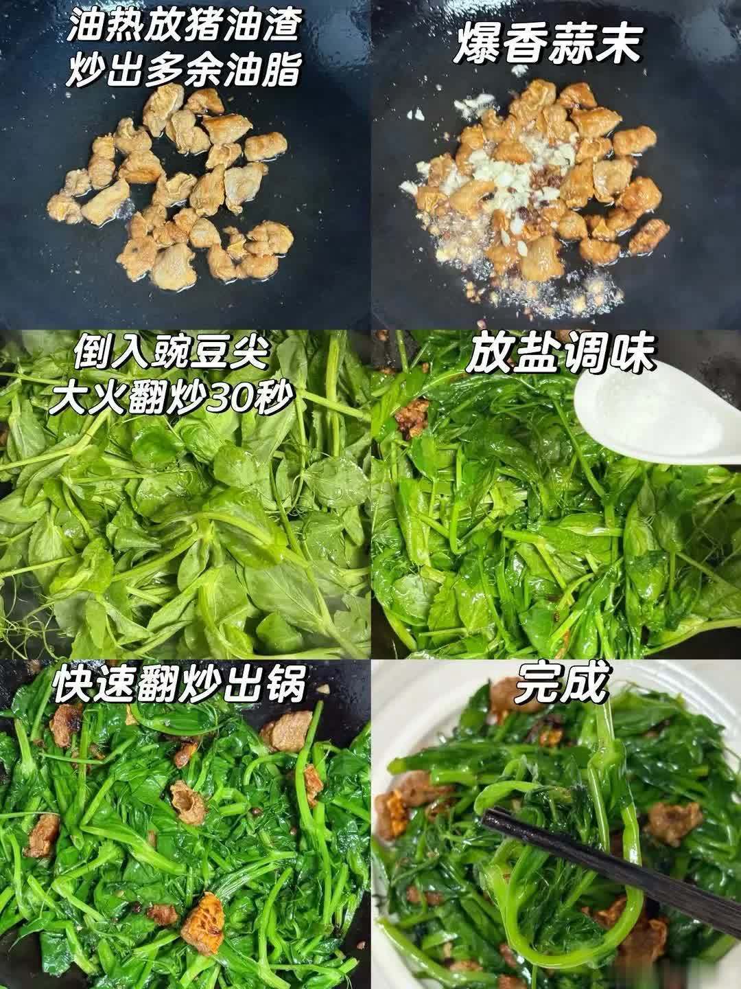 ✅ 亮点:豌豆尖炒猪油渣的亮点,是“素得清香,荤得焦脆”。