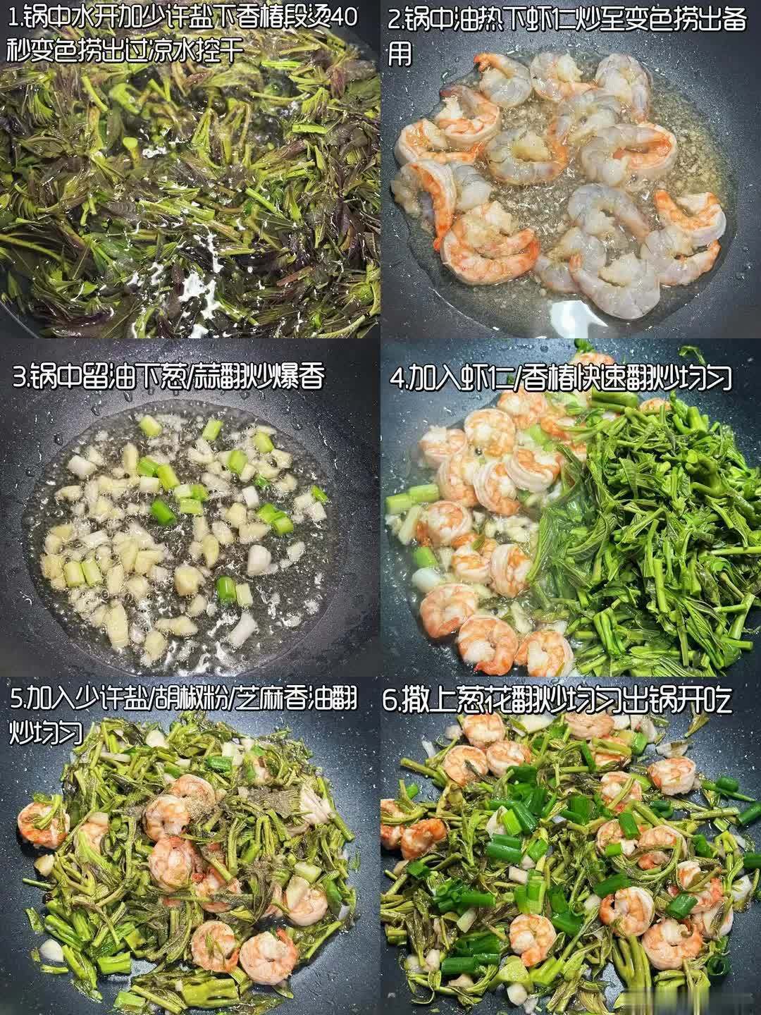 3️⃣锅中留油下葱蒜翻炒爆香,加入虾仁、香椿快速翻炒均匀,加入少许盐、胡椒粉、芝麻香油翻炒均匀,撒上葱花翻炒均匀出锅开吃!
