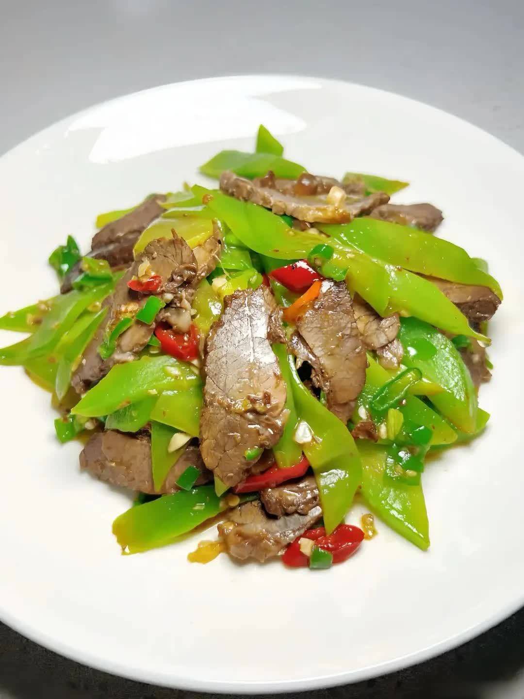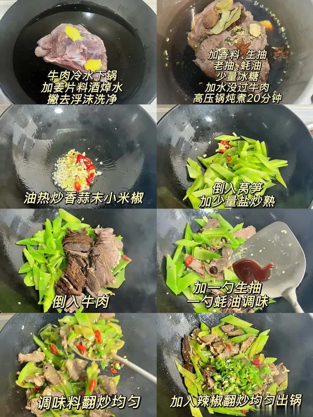 3️⃣热锅倒油,油热后下蒜末、小米辣爆香。再倒入莴笋片,加少许盐翻炒至断生,倒入切好的卤牛肉片,加一勺生抽、一勺蚝油调味,快速翻炒均匀。最后放青椒碎翻炒几下,就能出锅啦!